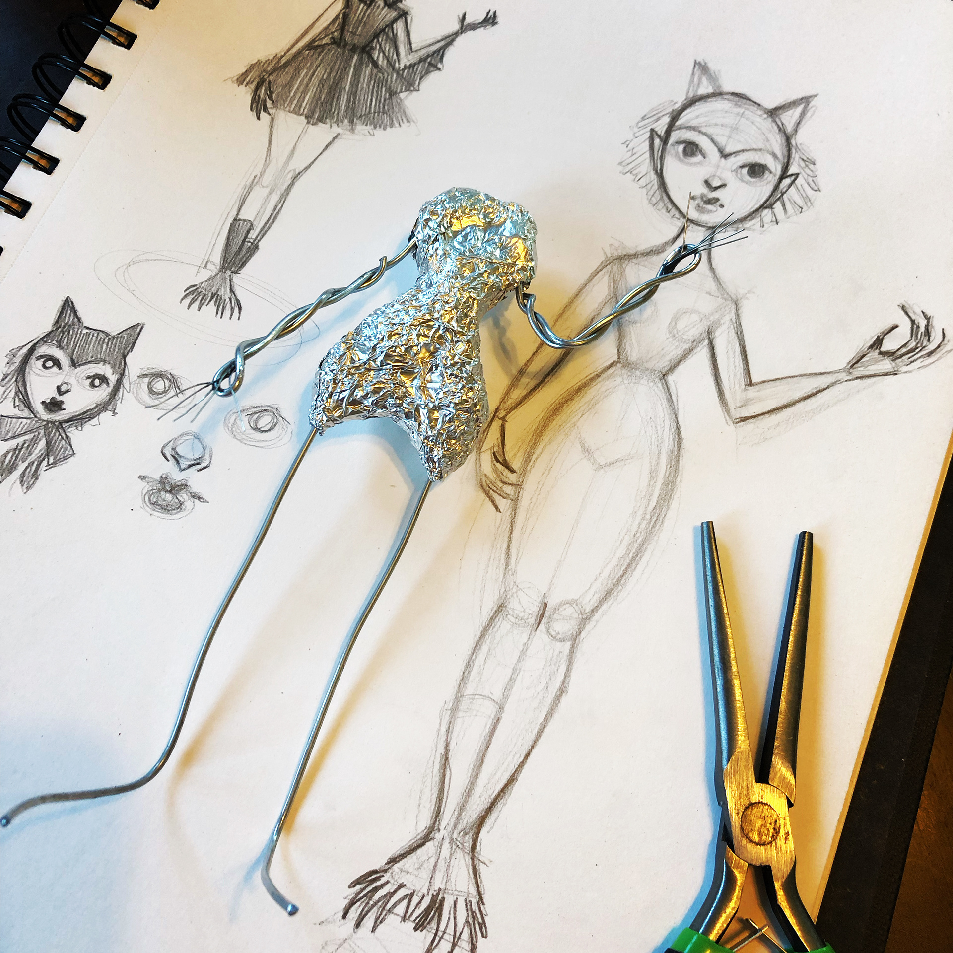 I tried to create Audrey's face in a way that reflected my 2D art style, with big far set eyes. I feel like my puppet style is still evolving but I was satisfied with the sculpting and painting of her face.